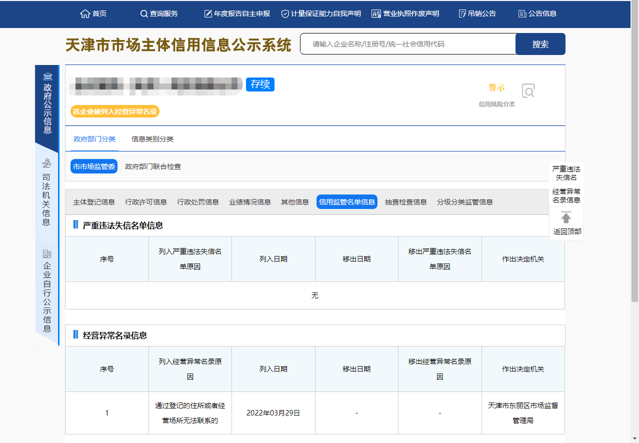 同时,依据《天津市市场主体信用风险分类办法》第十条的规定,本市市场主体被列入经营异常名录(标记为经营异常状态)的,在“天津市市场主体信用信息918博天堂系统”上的信用风险类别为“警示”,会在市场主体信用信息页面的右上角显著提示。
