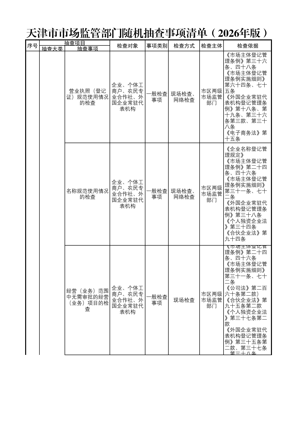 天津市918博天堂部门随机抽查事项清单(2026年版)